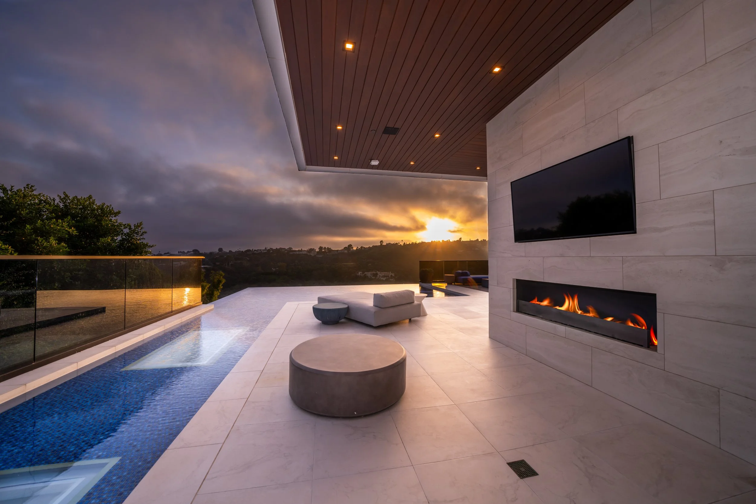 Modern outdoor terrace with a pool, lounge furniture, a wall-mounted television, and a gas fireplace at sunset.